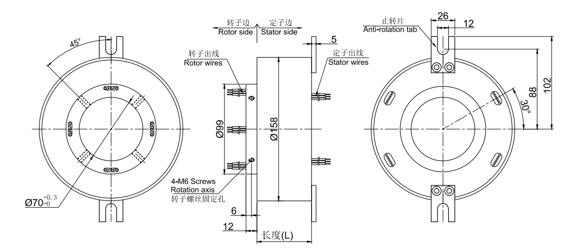 ● 外徑158mm, 通孔直徑為70mm(適用于<=70mm)的標(biāo)準(zhǔn)系列整體式精密導(dǎo)電滑環(huán)。*注意:如需<70mm的內(nèi)孔,可通過(guò)加內(nèi)襯軸套解決。
