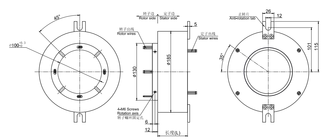 ● 外徑185mm, 通孔直徑為100mm,適用于<=100mm)的標(biāo)準(zhǔn)系列整體式精密導(dǎo)電滑環(huán)。*注意:如需<100mm的內(nèi)孔,可通過加內(nèi)襯軸套解決。