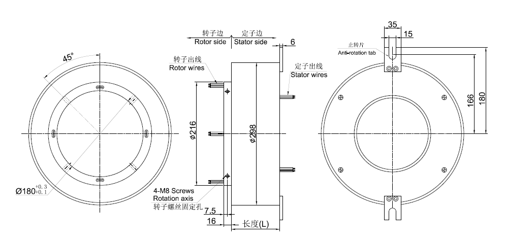 ● 外徑298mm, 通孔直徑為180mm,適用于<=180mm)的標準系列整體式精密導(dǎo)電滑環(huán)。*注意:如需<180mm的內(nèi)孔,可通過加內(nèi)襯軸套解決。
